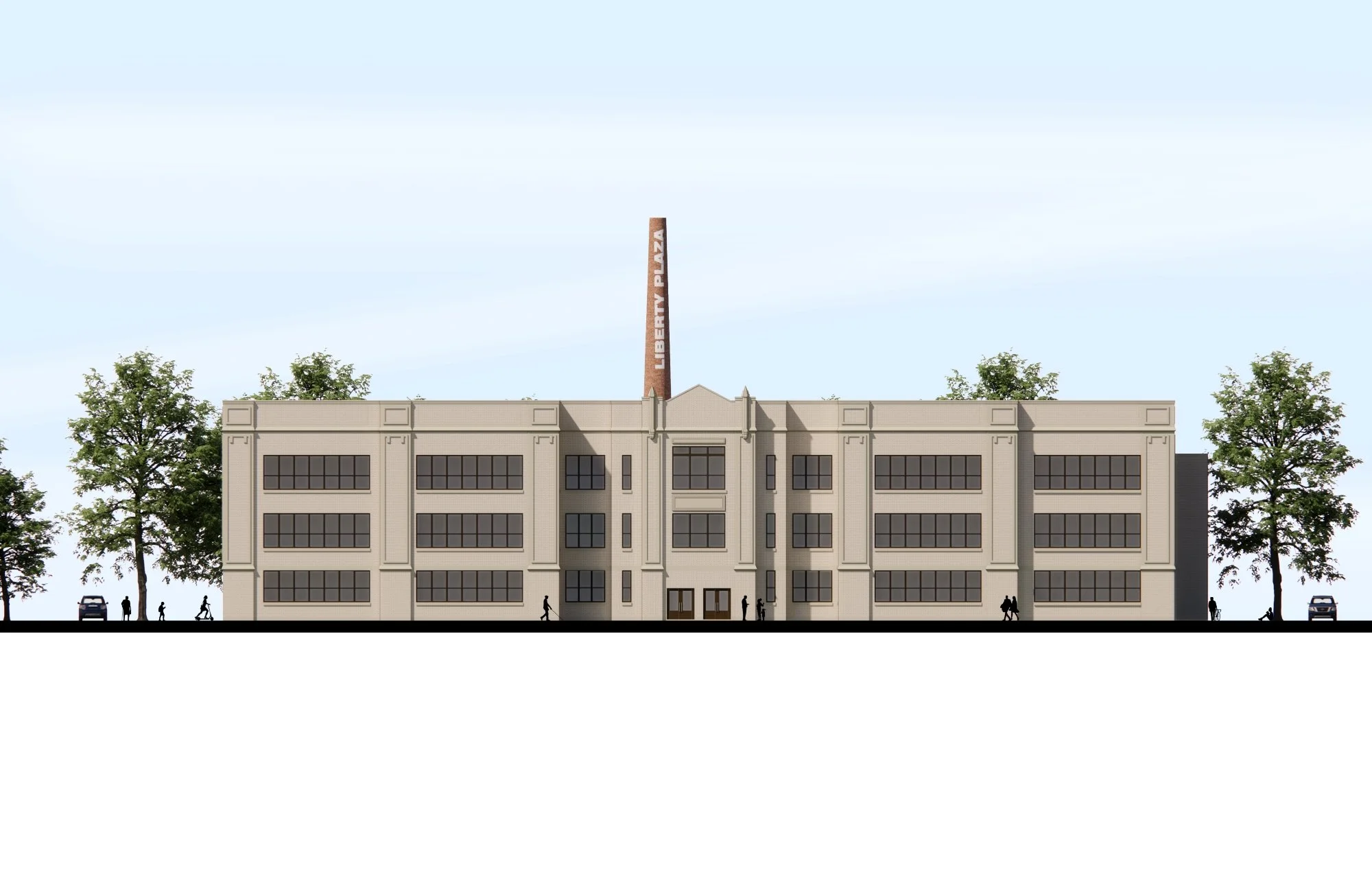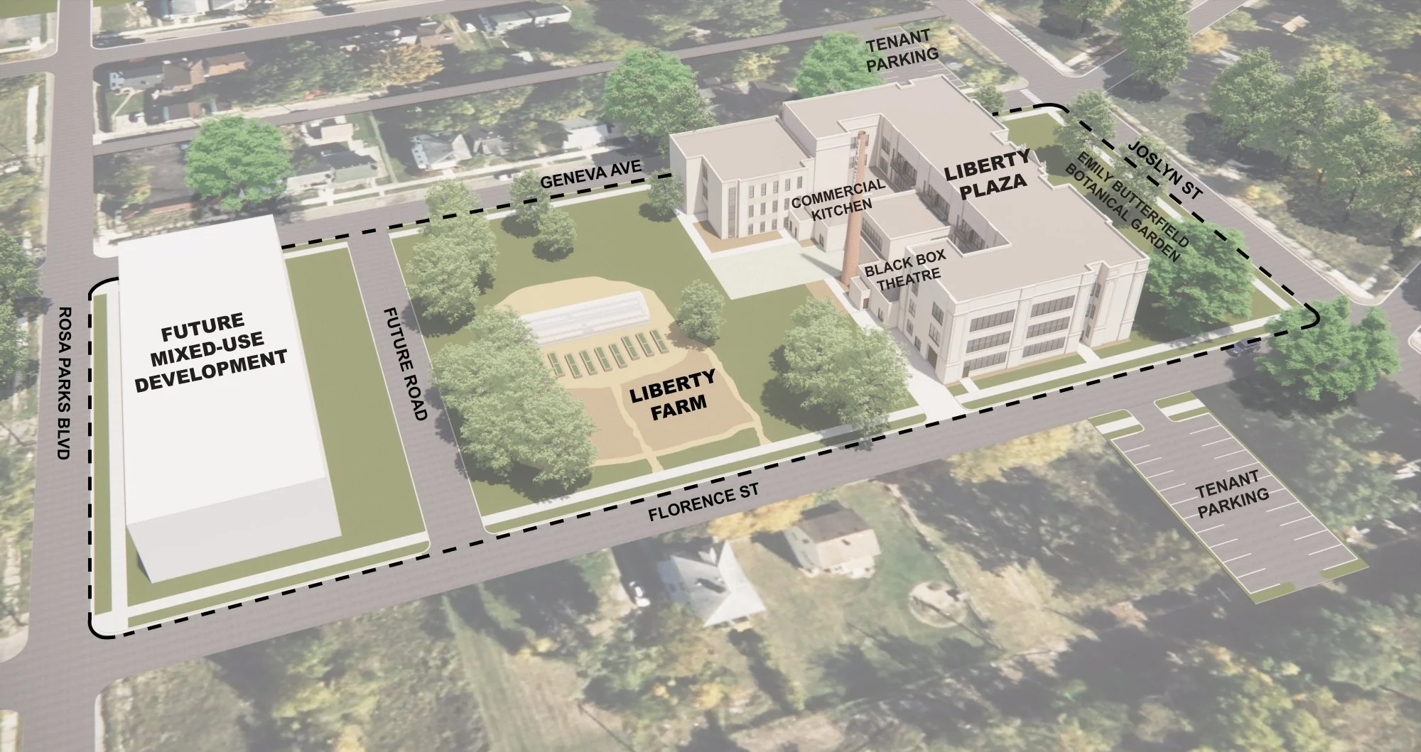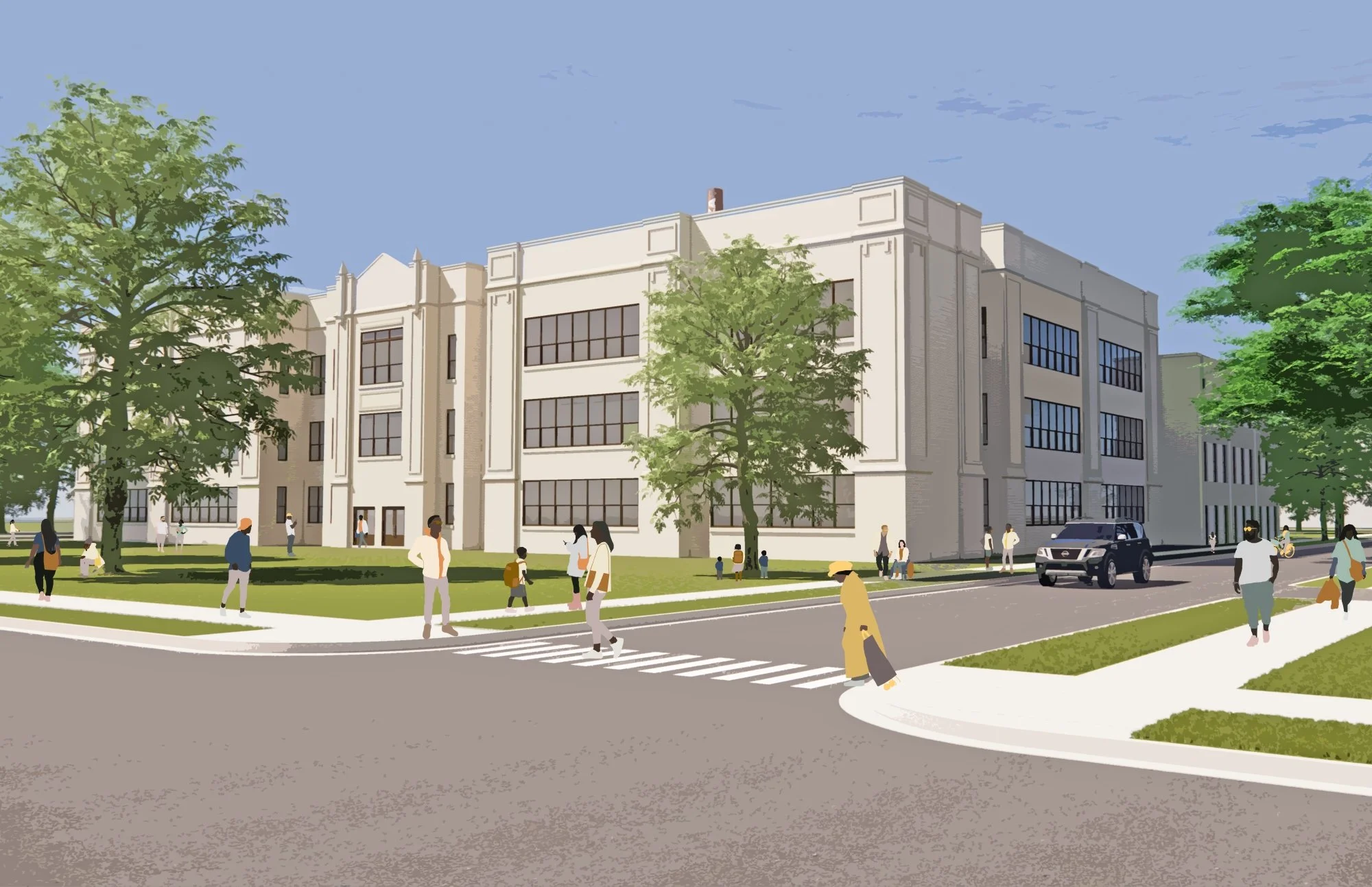 Adaptive reuse of the Liberty Academy, built in 1917, into a black box theatre, commercial kitchen space, and 53 residential units in partnership with Jamal Thomas, Equitable Development Initiative 2023 Cohort.