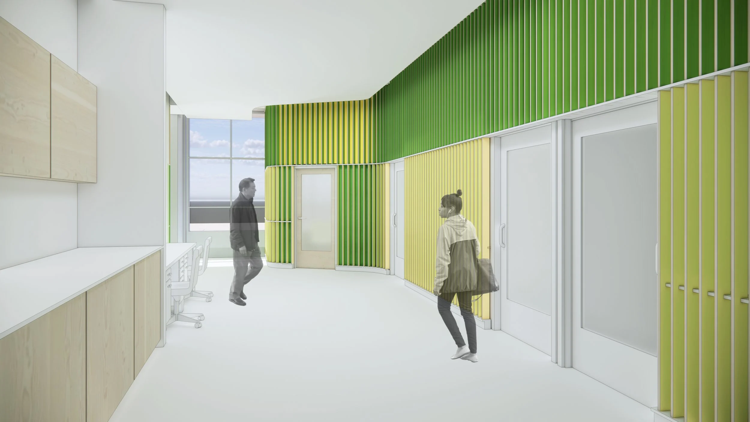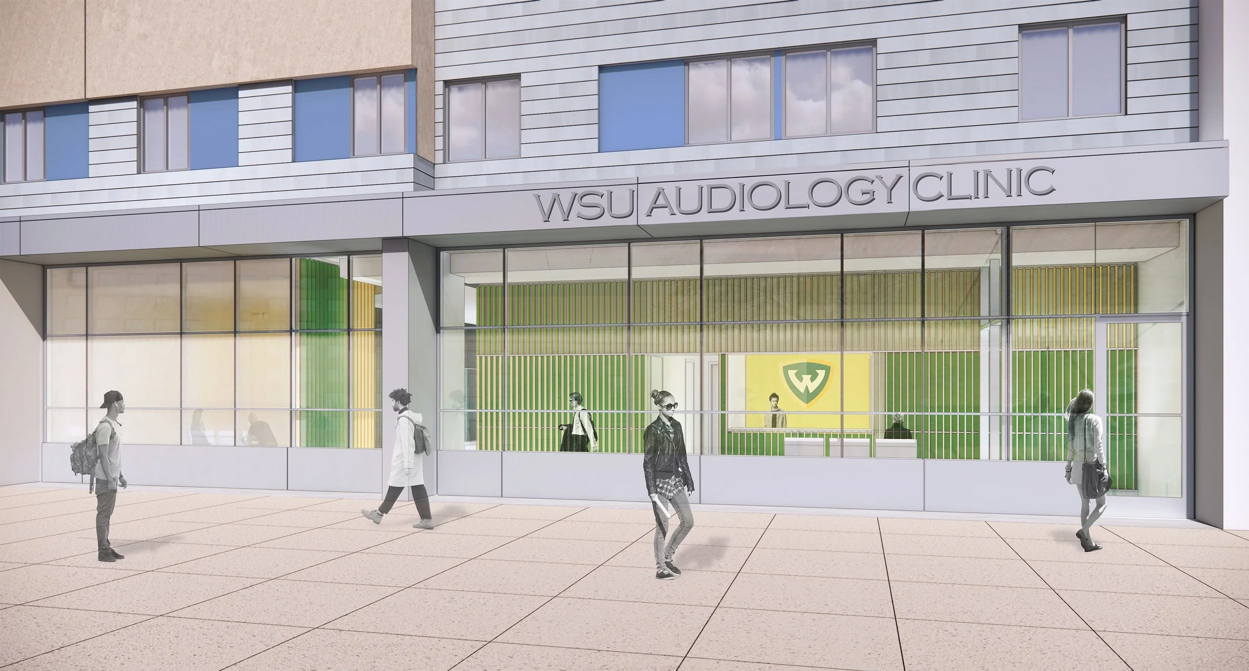 WSU Audiology Clinic is a training facility for the university's audiology doctoral program, located on the Midtown Detroit campus. The clinic provides audiologic evaluations for the metro Detroit community. InToto provided A/E services for the relocation of the Clinic to an existing retail space, increasing visibility and accessibility for patients, while supporting program expansion. The clinic contains specialized acoustic equipment, observation rooms, and testing rooms that require acoustic isolation. The acoustically sensitive program is organized internally with offices, waiting rooms, and conference rooms located at the building perimeter, isolating the acoustically sensitive program and providing natural light and visibility for clients and staff.